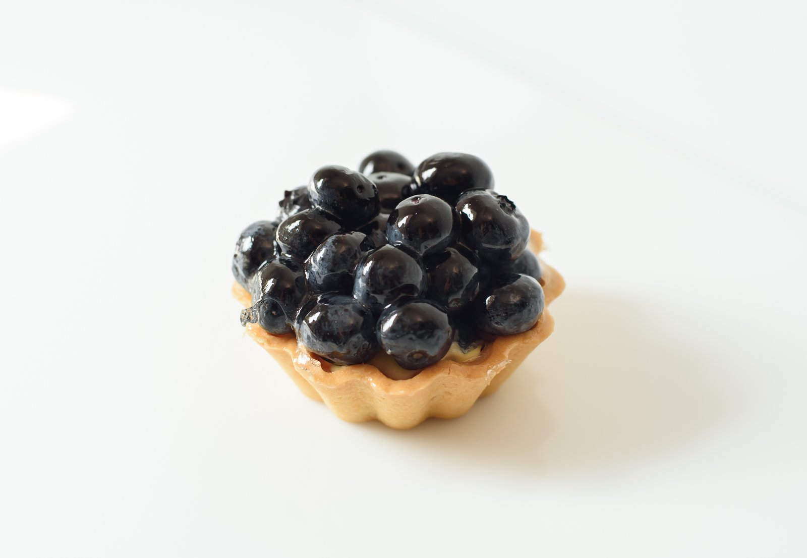 Kruchy, maślany spód wypełniony musem porzeczkowym i budyniem waniliowym, udekorowany soczystą borówką.