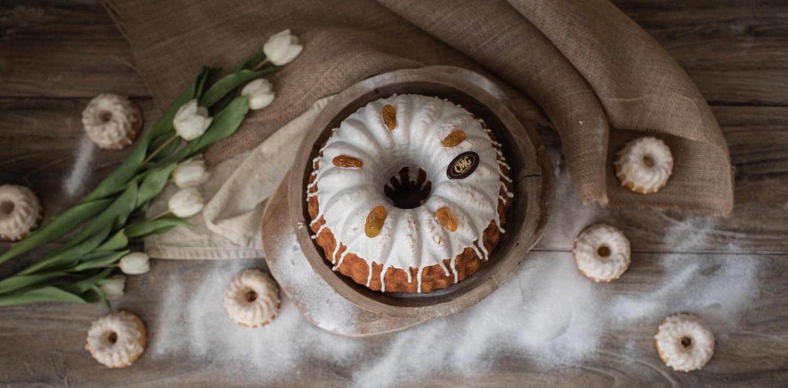 Tradycyjna babka około 20 cm o sypkiej, delikatnej strukturze i maślanym aromacie w świątecznej odsłonie.
