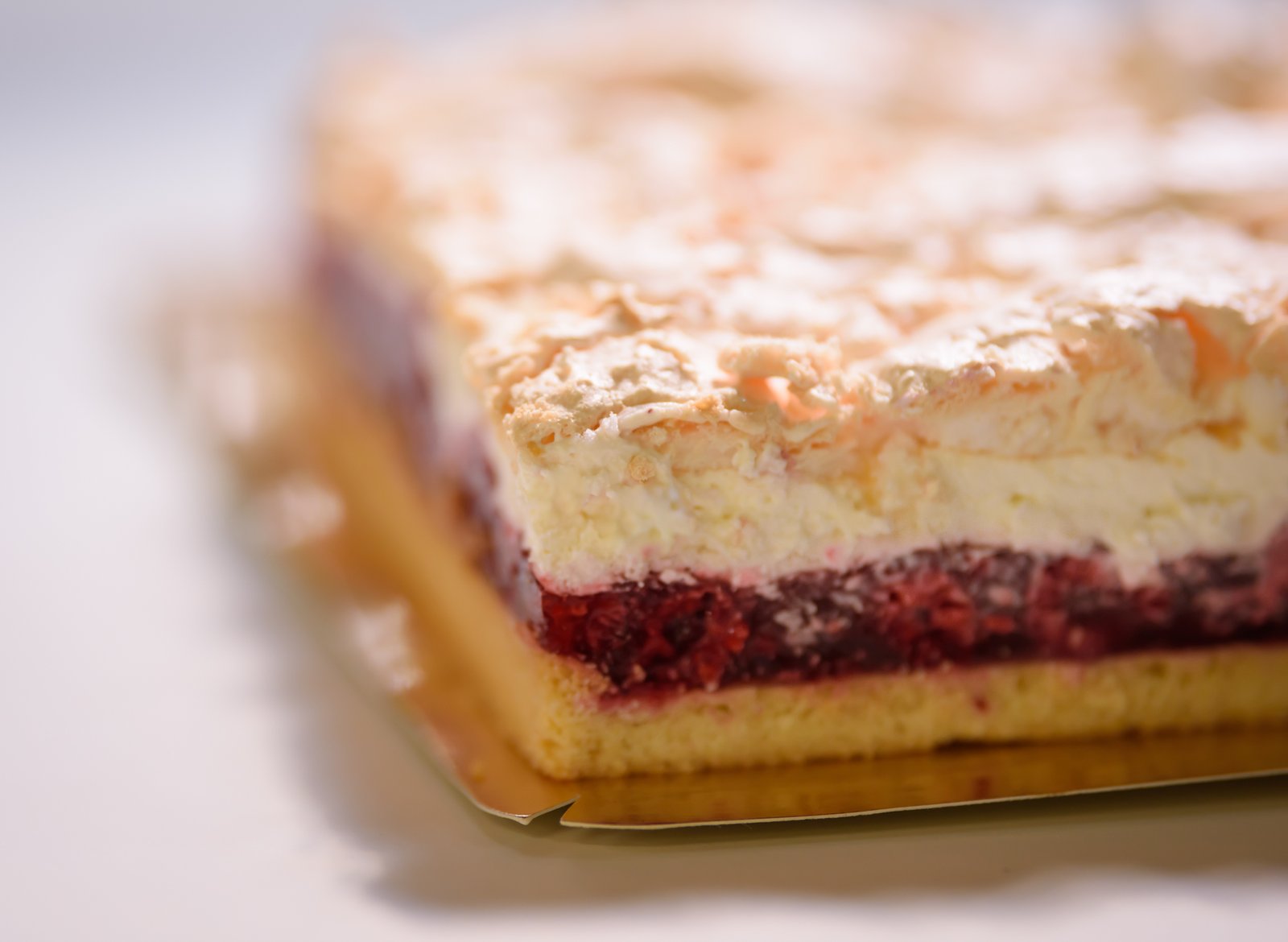 Delikatne ciasto z lekką bezą, kremem śmietankowym i świeżymi truskawkami zatopionymi w galaretce.