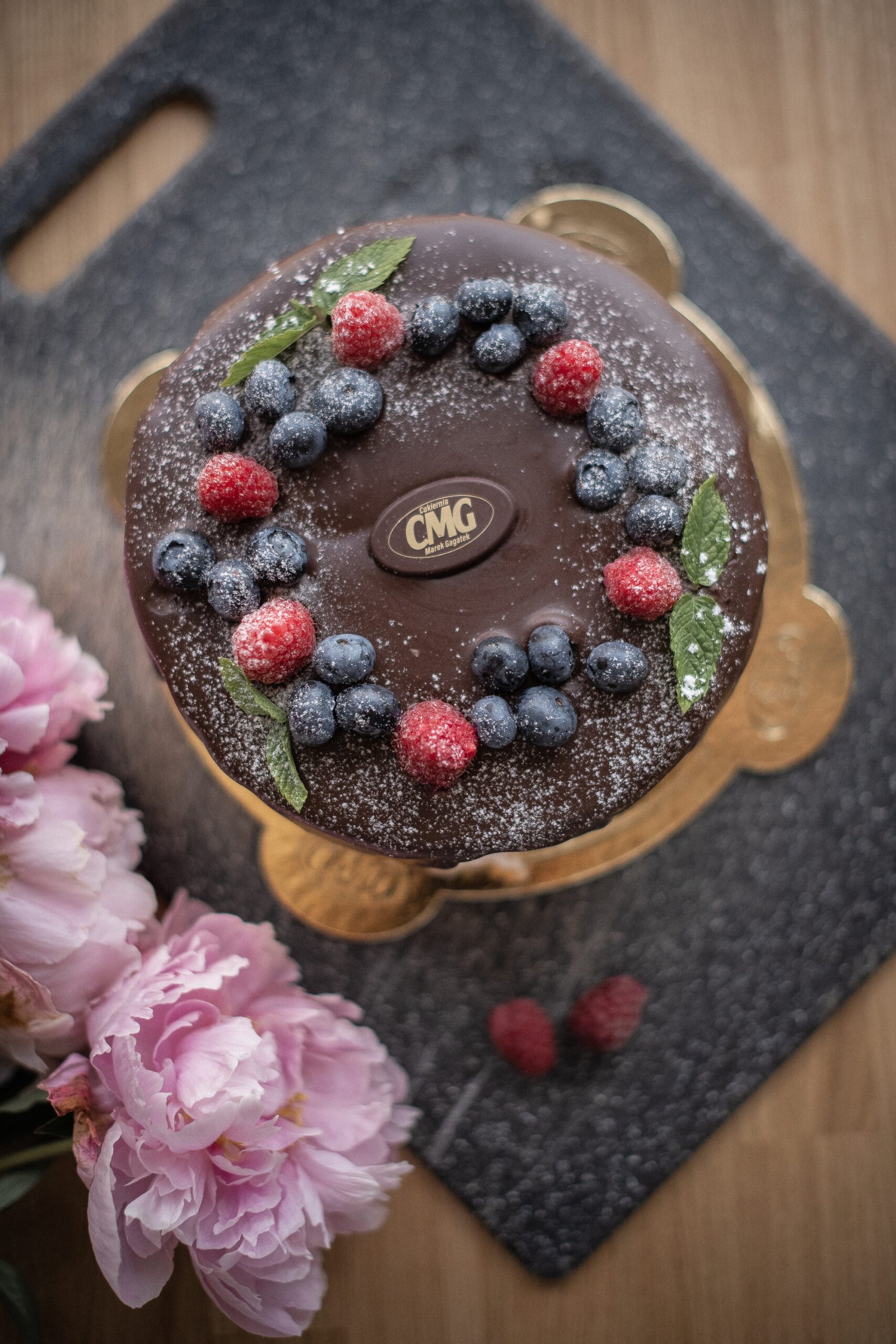 Delikatny biszkopt, krem na bazie mascarpone i śmietany, świeże owoce maliny i borówki. Całość wykończona lśniącym ganaszem z deserowej czekolady belgijskiej i dekoracją z owoców sezonowych.
