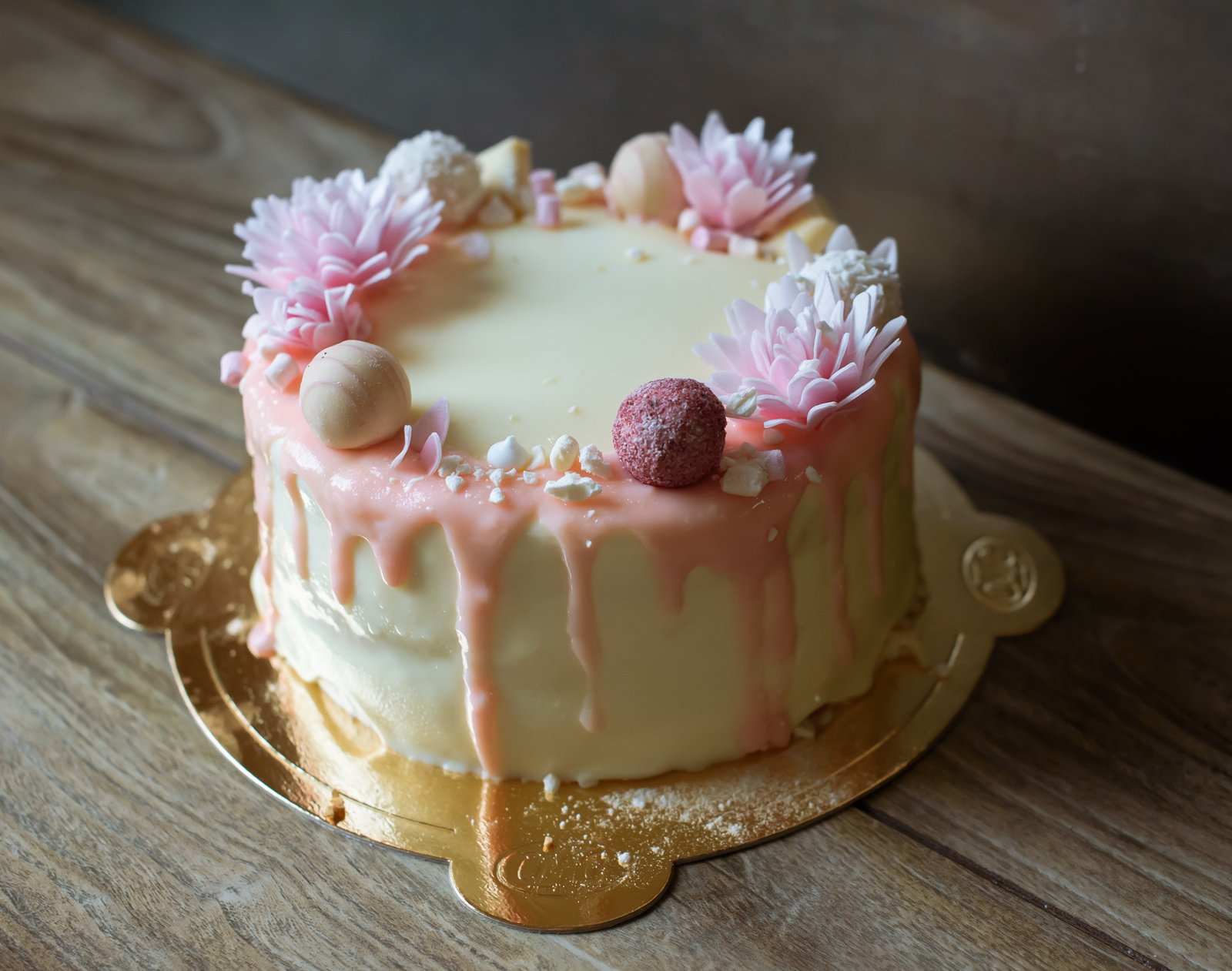 Beza kakaowa, krem z mascarpone i chałwą. Całość zwieńczona ziarnami granatu i prażonymi migdałami.