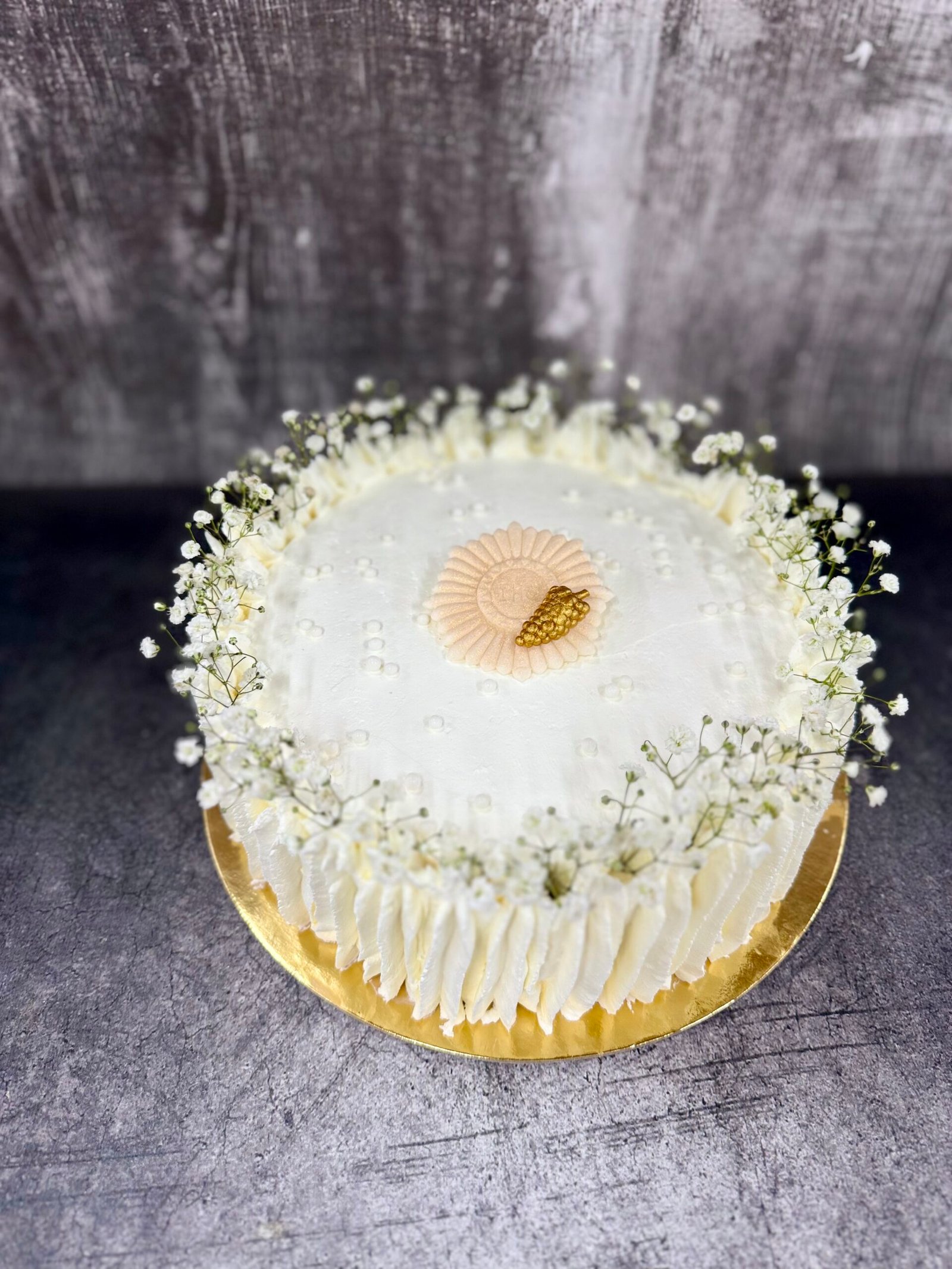 Lekki biszkopt jasny lub czekoladowy przełożony puszystą bitą śmietaną oraz owocami (truskawka, malina, wiśnia lub brzoskwinia), wykończony dekoracją z gipsówki