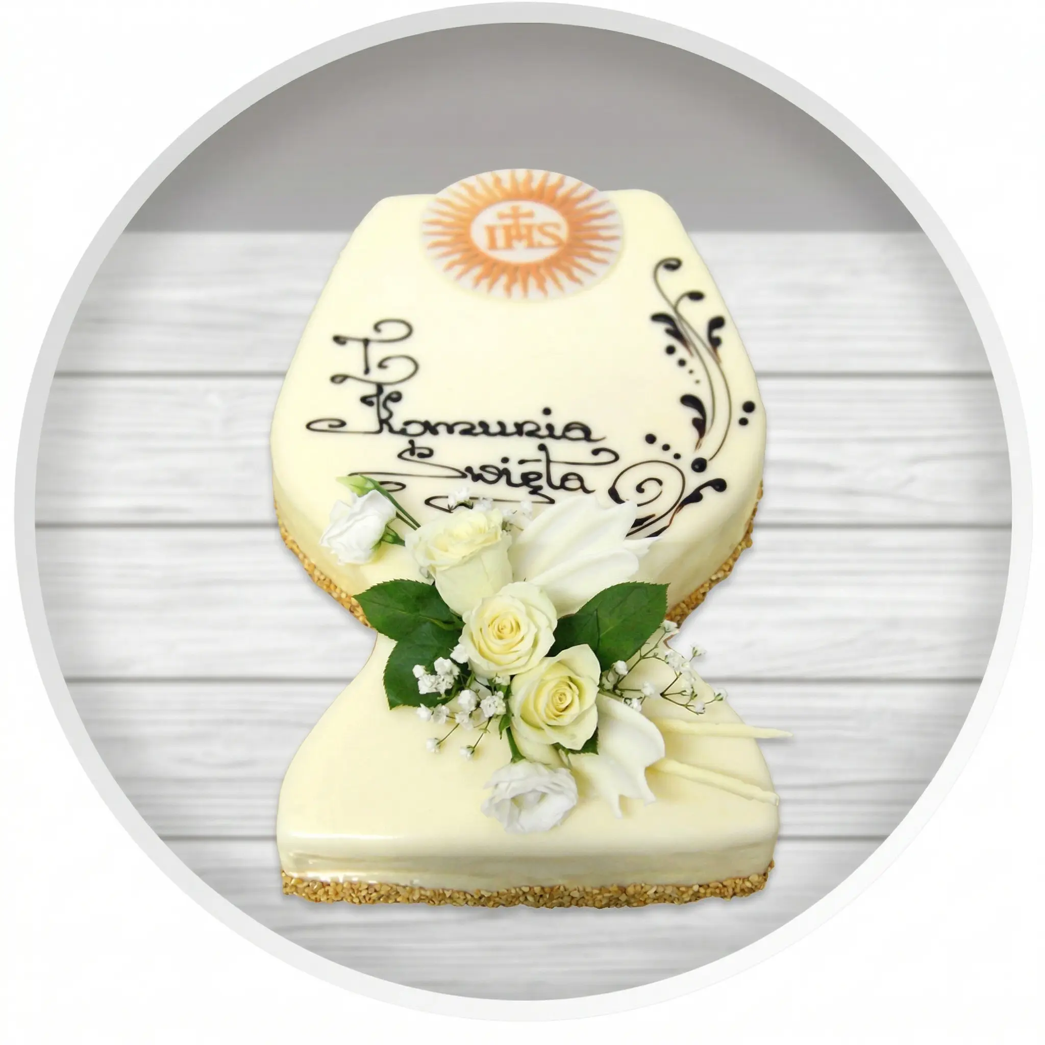 Tort w kształcie komunijnego kielicha – lekki biszkopt jasny lub czekoladowy, przełożony puszystą bitą śmietaną i owocami (truskawka, malina, wiśnia lub brzoskwinia), wykończony autorską polewą budyniową i dekoracją komunijną.