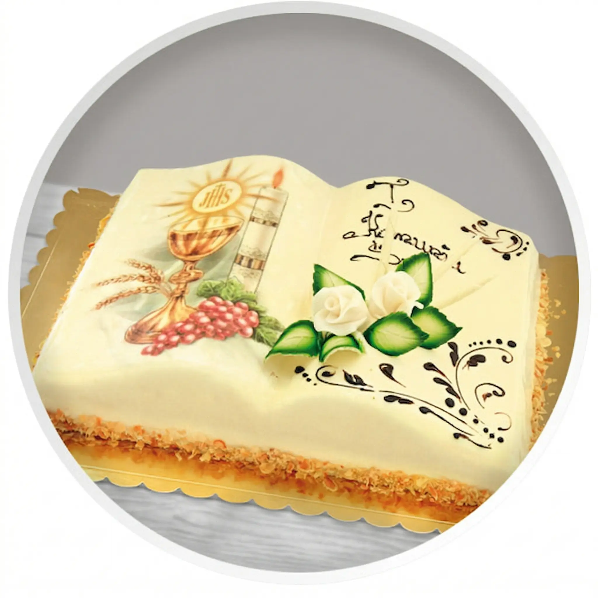 Tort w kształcie komunijnej książki – lekki biszkopt jasny lub czekoladowy, przełożony puszystą bitą śmietaną i owocami (truskawka, malina, wiśnia lub brzoskwinia), wykończony autorską polewą budyniową i dekoracją opłatkową.
